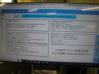 6年生が学級活動で、学級のキャラクター作りに取り組んでいます。クラスのイメージを膨らますために、イメージカラーや動物、果物などの自分たちで作ったアンケートをもとに思考ツールを使ってまとめました。次からいよいよキャラクター作りに入っていきます。