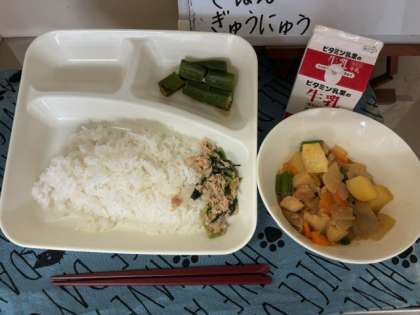 7月9日(火)の給食は、「鶏肉と野菜のみそ煮」「オクラの梅風味」「ツナっ葉いため」「ごはん」「牛乳」でした。