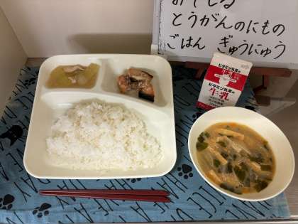 今日の給食は、「さけのしょうゆ風味焼き」「みそ汁」「とうがんの煮もの」「ごはん」「牛乳」でした。