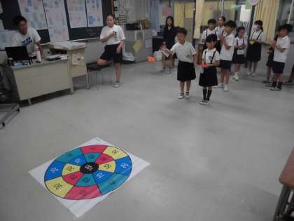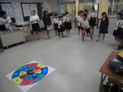 「しゃてき」は、柔らかいボールを床に置いてある的に向けて投げました。みんなの合計点で勝負です。なかなか接戦でした。