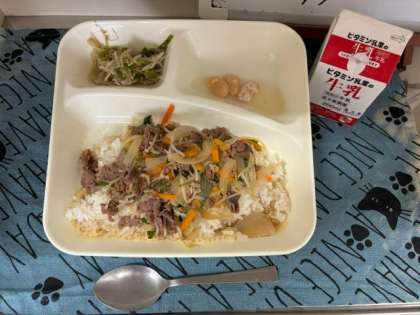 今日の給食は、「牛丼」「もやしとピーマンのごまいため」「大福豆の煮もの」「牛乳」でした。