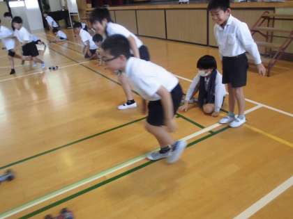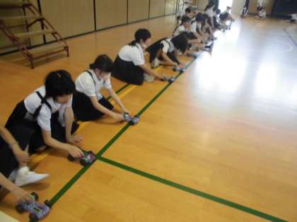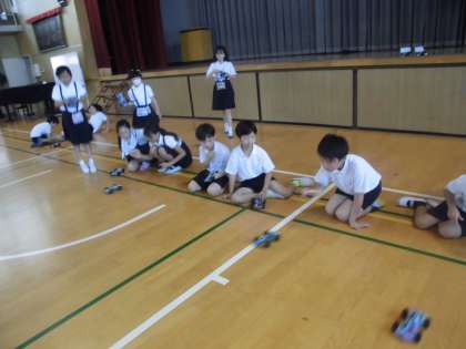 4年生が、理科の「電気のはたらき」の学習の最後にモーターカーの競争をしました。誰が一番早くゴール地点まで行くか競い合いました。楽しく盛り上がりました。