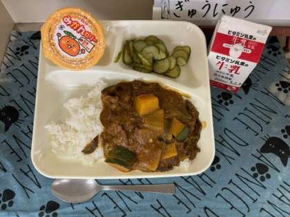 今日の給食は、「夏野菜のカレーライス」「きゅうりのサラダ」「みかんゼリー」「牛乳」でした。