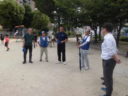 1学期の最終日ということで、地域、区役所、PTA、学校が合同で薄暮補導を行いました。三軒家公園を見回りました。三軒家東小学校の児童がたくさん遊んでいましたが、危ない遊びをしている児童はいませんでした。
