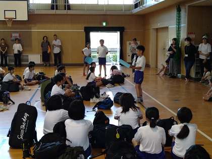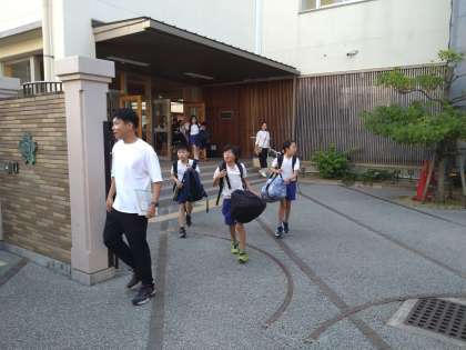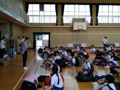 林間学習スタートです。出発式を行って、バスに乗り込みました。