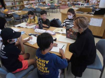 図書館開放も最終日となりました。PTA図書委員のお母さんから読書感想文の書き方のアドバイスをもらっている子もいました。
