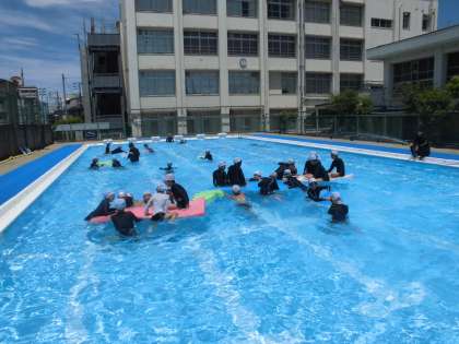 5,6年生も水泳の練習を頑張った後は、自由時間に夏休み限定の「浮き島」で楽しく遊びました。昨日まで林間に行っていた5年生もとても元気でした。