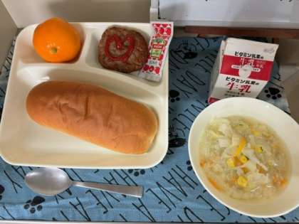 今日の給食は、「焼きハンバーグ」「豆乳スープ」「みかん(冷凍)」「黒糖パン」「牛乳」でした。