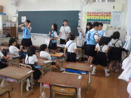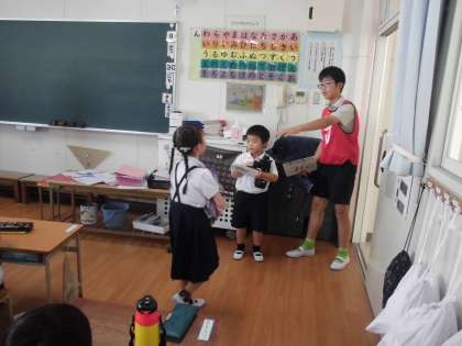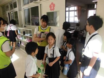 新三東集会は、縦割り班でお店を作り、前半と後半に分かれてそれぞれの縦割り班でお店を回っていきます。まずは、6年生が1年生を迎えに行きました。