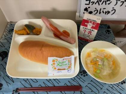 今日の給食は、「ウインナーのケチャップソース」「スープ」「焼きかぼちゃ」「コッペパン」「アプリコットジャム」「牛乳」でした。
