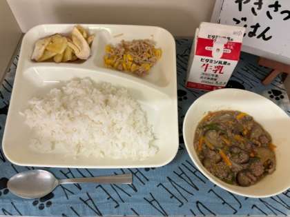 今日の給食は、「マーボーなす」「ツナと野菜のいためもの」「焼きさつまいもの甘みつかけ」「ごはん」「牛乳」でした。