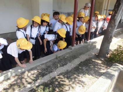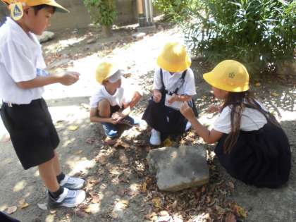 1年生が生活科の学習で虫さがしをしました。バッタやカマキリは見つかりませんでしたが、ダンゴムシやコオロギ、小さなちょうちょ、セミの抜け殻などが見つかりました。何匹もダンゴムシを集めている人もいました。