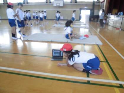 4年生が体育でマット運動の学習をしました。前転などをタブレットで横から撮影し、4秒遅らせて再生することで自分の動きを確認しながら練習しました。最後は開脚前転にも挑戦しました。