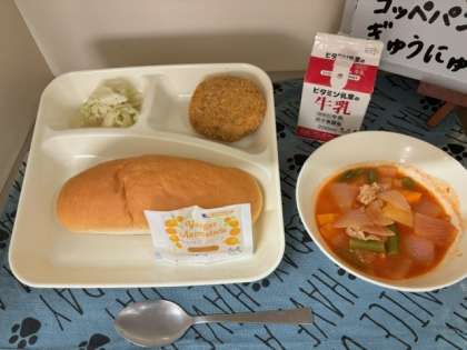 今日の給食は、「チキンレバーカツ」「ケチャップ煮」「キャベツのバジル風味サラダ」「コッペパン」「マーマレード」「牛乳」でした。