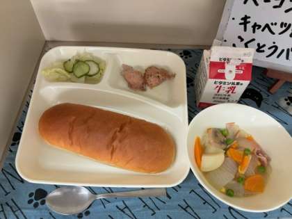 今日の給食は、「鶏肉のバジル焼き」「ベーコンと野菜のスープ煮」「キャベツときゅうりのサラダ」「黒糖パン」「牛乳」でした。