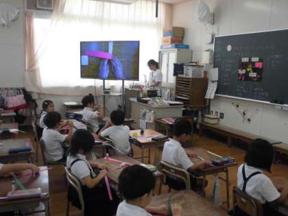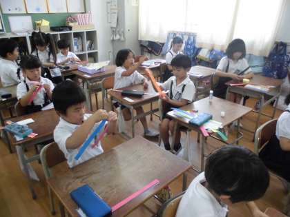1年生が図工で、紙を切ったり、折り曲げたり、いろいろ工夫して形を作る学習をしました。みんな先生の説明をしっかり聞いて、楽しみながら取り組んでいました。