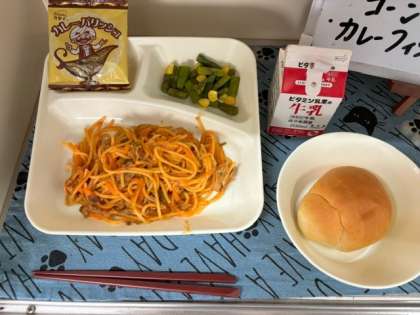 9月24日(火)は、「イタリアンスパゲッティ」「グリーンアスパラガスとコーンのサラダ」「カレーフィッシュ」「ミニコッペパン」「牛乳」でした。