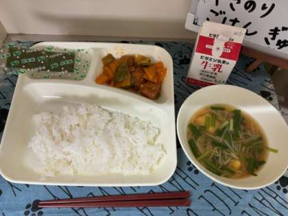 今日の給食は、「酢豚」「中華みそスープ」「焼きのり」「ごはん」「牛乳」でした。
