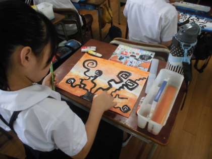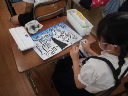 4年生が図工で「カクカクの木 クネクネの木」の学習をしました。カクカクしたりクネクネしたりした木を描いて、グラデーションの空を描きました。みんな水の量を上手に調節してグラデーションをつけていました。