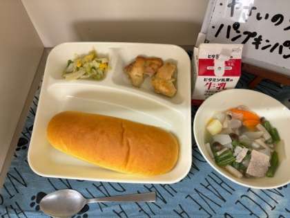 1日の給食は、「鶏肉のカレー風味焼き」「スープ煮」「野菜のソテー」「パンプキンパン」「牛乳」でした。