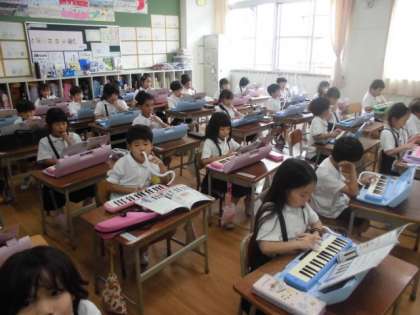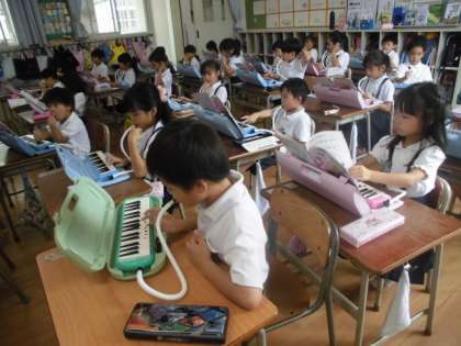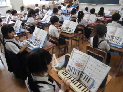 1年生が、音楽で鍵盤ハーモニカの学習を行いました。正しい指使いができるよう何度も繰り返し取り組みました。