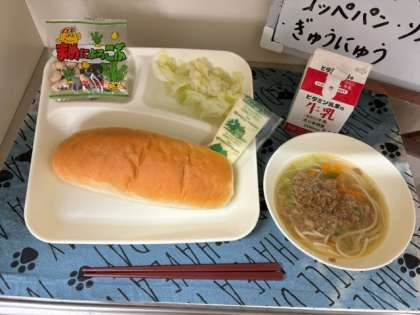 今日の給食は、「タンタンめん」「あっさりキャベツ」「豆こんぶ」「コッペパン」「ソフトマーガリン」「牛乳」でした。