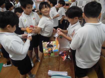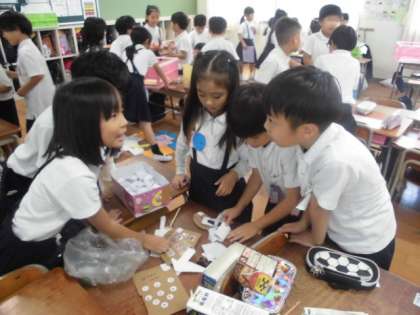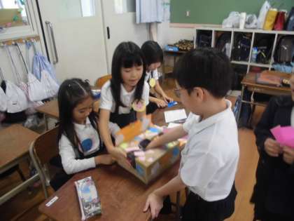 2年生が学級会で話し合って、計画を立てた「あきまつり」をしました。児童会で行った「三東まつり」をもとにして、クラスで行いました。グループごとにしっかり役割分担をして楽しく活動しました。