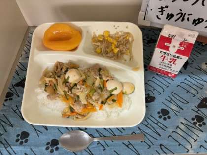 今日の給食は、「中華丼」「もやしとコーンのごまいため」「黄桃(缶詰)」「牛乳」でした。「中華丼」は、卵の除去食対応献立です。