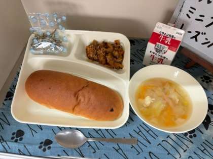 今日の給食は、「なすのミートグラタン」「鶏肉とキャベツのスープ」「ミニフィッシュ」「レーズンパン」「牛乳」でした。