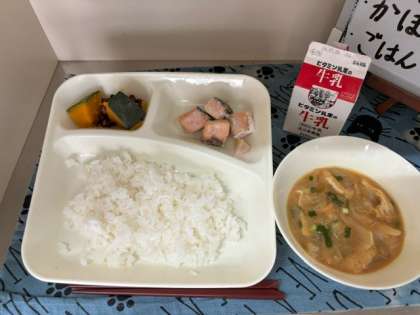 今日の給食は、「さけの塩焼き」「みそ汁」「かぼちゃのいとこ煮」「ごはん」「牛乳」でした。
