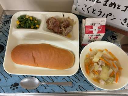 今日の給食は、「豚肉のガーリック焼き」「鶏肉と野菜のスープ」「さんどまめとコーンのソテー」「黒糖パン」「牛乳」でした。