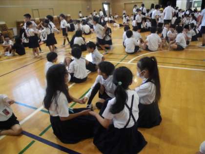 児童集会で「もうじゅうがりに行こうよ」をしました。1年生から6年生までみんなで楽しくグループを作って交流を深めました。