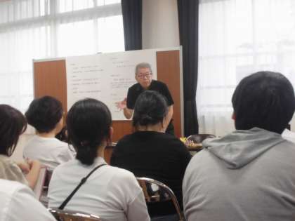 授業の後は、研究討議会を行いました。授業改善に向けてしっかりと話し合いが行われ、講師の先生から指導講評を受けました。その後は、実技研修会を行いました。「考える授業づくり〜楽器を使って自分と対話する〜」というテーマで研修し、最後は、参加した教員全員で「あおい そらに えを かこう」を合唱しました。