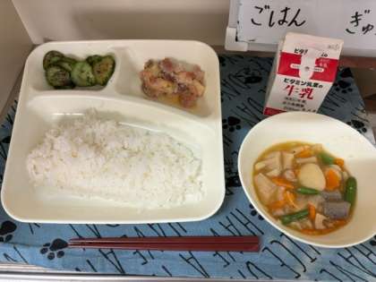 今日の給食は、「豚肉のねぎじょうゆ焼き」「ふきよせ煮」「きゅうりの赤じそあえ」「ごはん」「牛乳」でした。