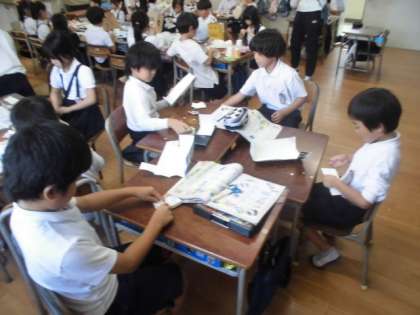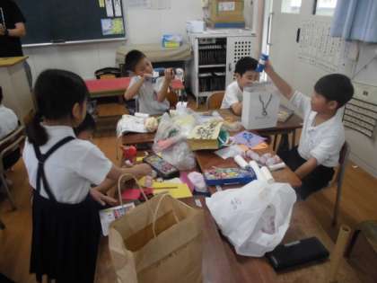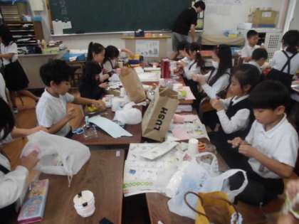 2年生が生活科でおもちゃ作りをしました。班ごとに分かれて楽しく活動しました。