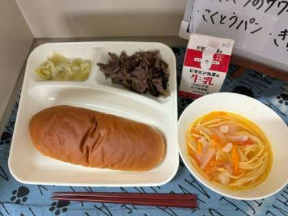 23日(水)の給食は、「牛肉の香味焼き」「トマトのスープスパゲッティ」「キャベツのサワーソテー」「黒糖パン」「牛乳」でした。