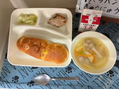 今日の給食は、「かつおのガーリックマリネ焼き」「ウインナーとじゃがいものスープ」「キャベツのサラダ」「おさつパン」「牛乳」でした。