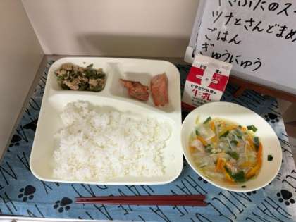 今日の給食は、「鶏肉のチリソース焼き」「焼き豚のスープ」「ツナとさんどまめのオイスターソースいため」「ごはん」「牛乳」でした。