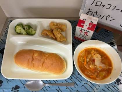 今日の給食は、「白身魚フリッター」「ミネストローネ」「ブロッコリーのサラダ」「おさつパン」「牛乳」でした。