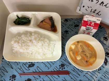 今日の給食は、「なまりぶしのしょうが煮」「なめこのみそ汁」「ほうれんそうのごまあえ」「ごはん」「牛乳」でした。