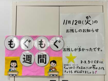 今日は、もぐもぐ週間2日目です。昨日のお残しの結果は、スープのお残しが多かったので、☆1つでした。今日も、☆3つを目指して、みんなで頑張って食べていました。