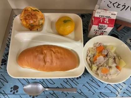 今日の給食は、「豚肉と野菜のスープ煮」「変わりピザ」「みかん」「黒糖パン」「牛乳」でした。