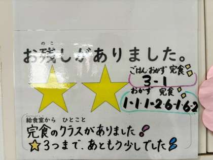 昨日のお残しの結果は、星2つでした。完食していたクラスもあり、星3つまであともう少しでした。今日も星3つを目指して、みんなでがんばっていました。