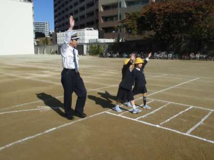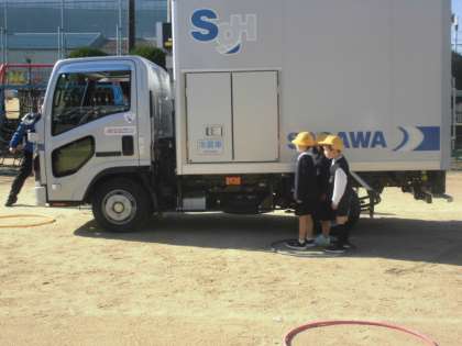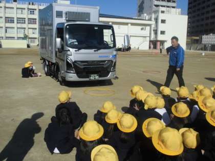 歩き方の指導の後は、トラックの運転席からの死角についてのお話も聞きました。こんな場所が見えないということにみんな驚いていました。