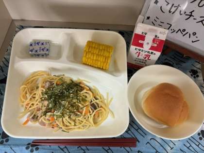 今日の給食は、「ウインナーときのこの和風スパゲッティ」「きざみのり」「焼きとうもろこし」「固形チーズ」「ミニコッペパン」「牛乳」でした。