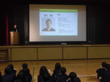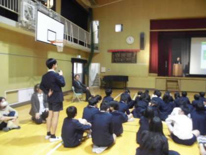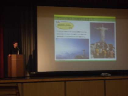 三重県鈴鹿市にあるブラジル人学校のみなさんをお迎えして、国際交流事業をしました。初めに、元ブラジルのプロサッカー選手の岸本さんからブラジルについてのお話をお聞きしました。とても興味深い話でみんなしっかりと聞いていました。