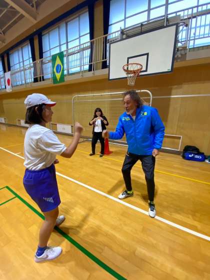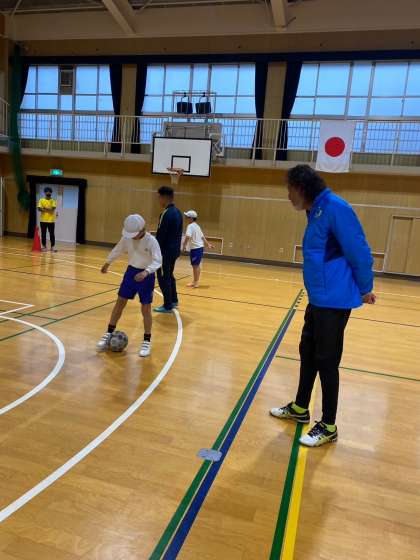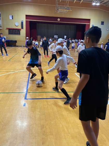 雨が降って体育館での交流となりましたが、コーチのみなさんがとても楽しいメニューを考えてくださり、楽しくサッカーをすることができました。