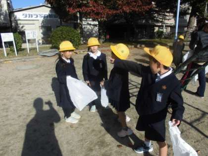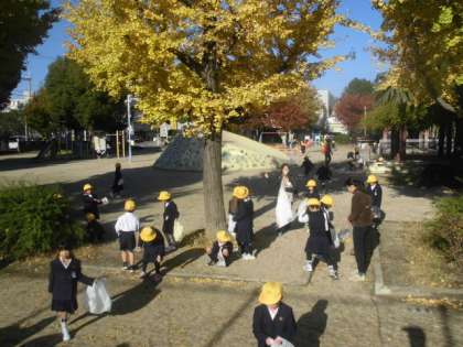 1年生が、三軒家公園に秋見つけに行きました。たくさんの紅葉した葉っぱを集めていました。