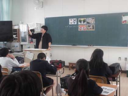 美術の出前授業はデカルコマニーをしました。ちょうちょの絵に絵の具で模様を描きました。折りたたんで絵の具を広げて開いてみると、とてもきれいな模様になっていました。みんなとても喜んでいました。