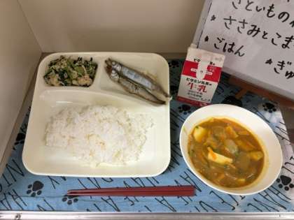 26日の給食は、「焼きししゃも」「さといもの和風カレー汁」「ささみとこまつなのいためもの」「ごはん」「牛乳」でした。